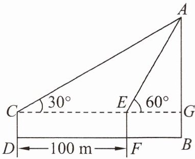 6. 如图,为了测量电视塔 $ AB $ 的高度,在 $ D $ 处用高为 $ 1 \, m $ 的测角仪 $ CD $,测得电视塔顶端 $ A $ 的仰角为 $ 30^{\circ} $,再向电视塔方向前进 $ 100 \, m $ 到达 $ F $ 处,又测得电视塔顶端 $ A $ 的仰角为 $ 60^{\circ} $,求电视塔 $ AB $ 的高度.