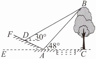 19. (9 分)如图,某数学活动小组要测量小河对岸大树 $BC$ 的高度. 他们先在斜坡上的 $D$ 处测得大树顶端 $B$ 的仰角是 $30^{\circ}$,再沿着斜坡走 $6\mathrm{m}$ 到达坡底 $A$ 处,在 $A$ 处测得大树顶端 $B$ 的仰角是 $48^{\circ}$. 若坡角 $\angle FAE = 30^{\circ}$,求大树 $BC$ 的高度.(结果保留整数. 参考数据:$\sin 48^{\circ} \approx 0.74$,$\cos 48^{\circ} \approx 0.67$,$\tan 48^{\circ} \approx 1.11$,$\sqrt{3} \approx 1.73$)