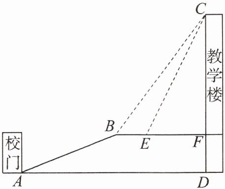 18. (9 分)某中学依山而建. 校门 $A$ 处有一斜坡 $AB$,其长度为 $13\mathrm{m}$. 在坡顶 $B$ 处看教学楼 $CF$ 的楼顶 $C$ 的仰角 $\angle CBF = 53^{\circ}$. 离 $B$ 点 $4\mathrm{m}$ 远的 $E$ 处有一花坛,在 $E$ 处看教学楼 $CF$ 的楼顶 $C$ 的仰角 $\angle CEF = 63.4^{\circ}$. 已知 $CF$ 的延长线交校门处的水平面于 $D$ 点,$FD = 5\mathrm{m}$.
