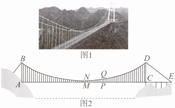 例 2 悬索桥,又名吊桥,其缆索的形状一般近似于抛物线。从缆索垂下许多吊杆(吊杆垂直于桥面),把桥面吊住。某悬索桥(图 1)是连接甲、乙两个地区的重要通道。图 2 是该悬索桥的示意图。小明通过查找资料了解到此桥的相关信息:这座桥的缆索(即图 2 中桥上方的曲线)的形状近似于抛物线,两端的索塔在桥面以上部分高度相同,即 $ AB = CD $,两个索塔均与桥面垂直。主桥 $ AC $ 的长为 $ 600 \, m $,引桥 $ CE $ 的长为 $ 124 \, m $。缆索最低处的吊杆 $ MN $ 长 $ 3 \, m $,桥面上与点 $ M $ 相距 $ 100 \, m $ 的吊杆 $ PQ $ 长 $ 13 \, m $。若将缆索的形状视为抛物线,请你根据小明获得的信息,建立适当的平面直角坐标系,求索塔顶端 $ D $ 与锚点 $ E $ 之间的距离。