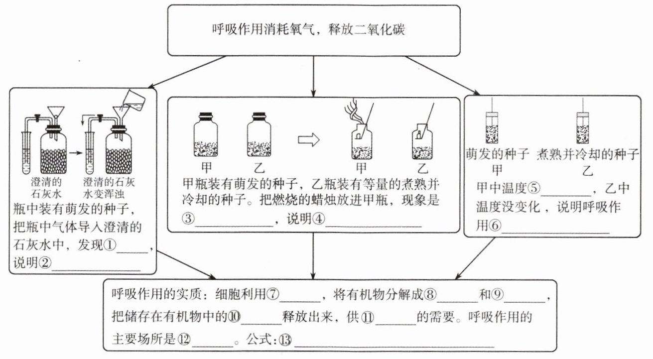 ① 澄清的石灰水变浑浊 ② 呼吸作用放出了二氧化碳 ③ 燃烧的蜡烛熄灭 ④ 呼吸作用消耗了氧气 ⑤ 升高 ⑥ 放出了热量 ⑦ 氧 ⑧ 二氧化碳 ⑨ 水 ⑩ 能量 ⑪ 生命活动 ⑫ 线粒体 ⑬ 有机物(储存着能量)+氧气→二氧化碳+水+能量