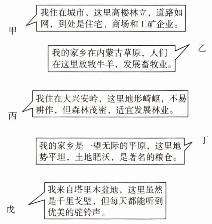 点拨:本题主要考查学生运用学科知识解决实际问题的能力,要求学生注重理论联系实际,关注身边的生物学知识和环保意识,答题的关键是从每个对话中提炼关键词,如森林、土壤肥沃、城市、草原、戈壁等。