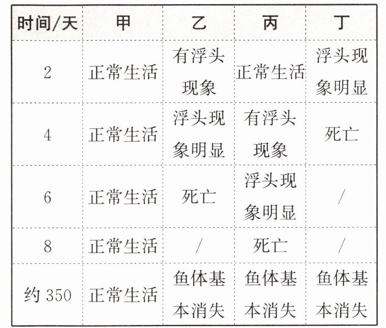 (3)乙、丙、丁中的鱼先后出现浮头现象,原因是