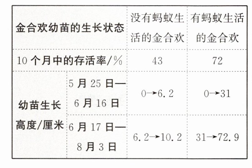 4. 某种金合欢有大而中空的刺,蚂蚁栖居其中,并以金合欢嫩叶尖端为食。有人针对此现象提出了这样的问题:蚂蚁栖居在金合欢中,对金合欢的生长有害吗?请根据上述信息回答下列问题: