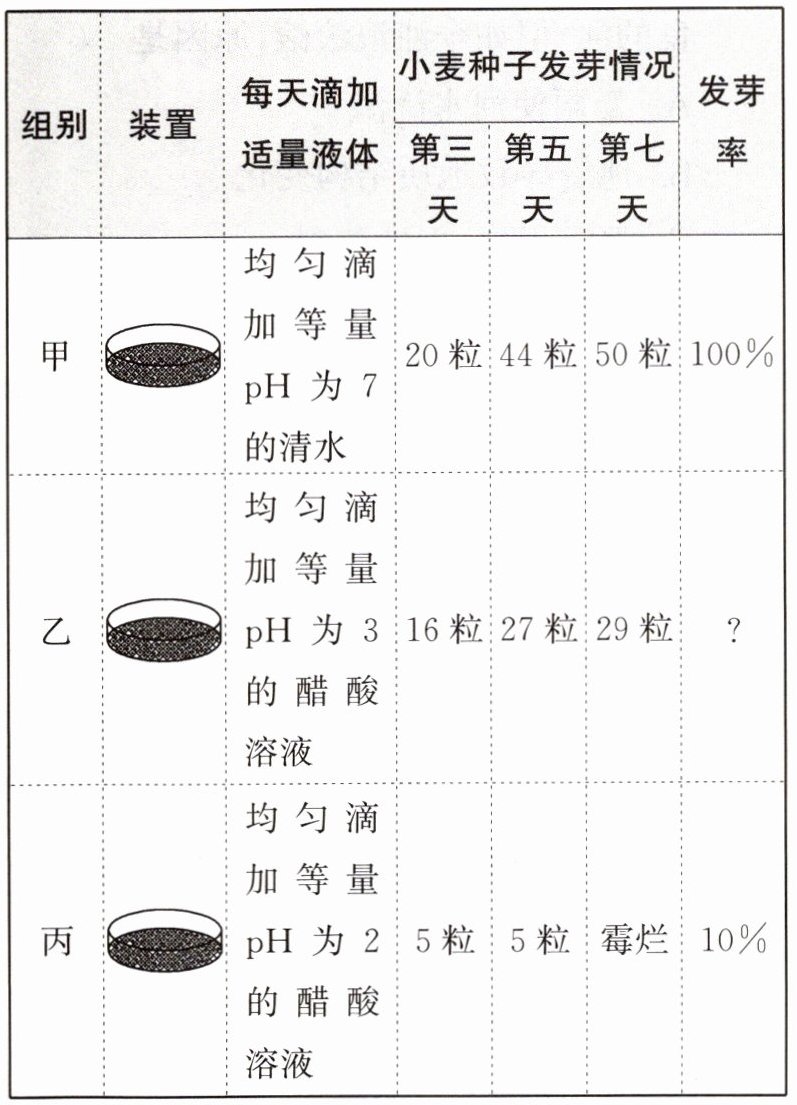12. 为探究酸雨对种子萌发的影响,某同学进行了以下模拟实验:用食醋和清水配制成了pH为2和3的醋酸溶液模拟酸雨(注:pH为酸碱度,值越小,酸性越强);用同一批大小、质量等相近的饱满小麦种子,每组50粒,放入底部垫有五层湿润吸水纸的培养皿中(装置如图),实验过程及结果如表: