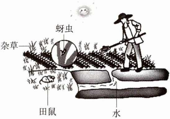 (1)生物 非生物 (2)阳光、土壤、水、空气等(任选两个即可) 蚜虫、人、杂草、田鼠(任选两个即可)(3)竞争 捕食
