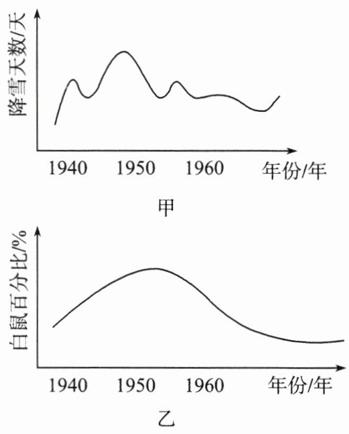 12. 如图甲表示1940—1960年某地降雪天数,图乙表示在同一时间内该地区白鼠占同种个体的百分数。请分析回答下列问题: