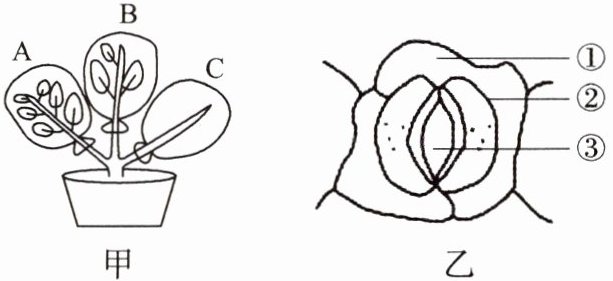 (2)用镊子撕取图甲装置中植物的叶的下表皮,将其放在载玻片上的水滴中,并盖上盖玻片,镜下观察到如图乙所示结构。结构③是