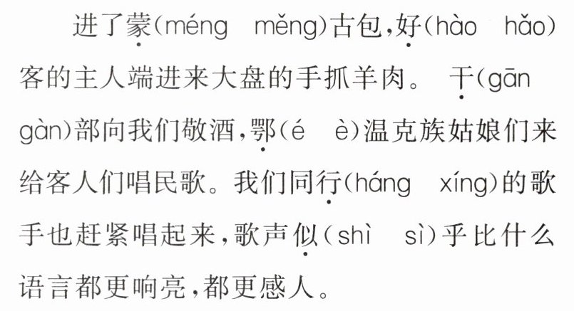 )(3) 课文结尾句“蒙汉情深何忍别,天涯碧草话斜阳”既写出了蒙汉人民话别的场景,又点明了文章要表达的思想感情。(