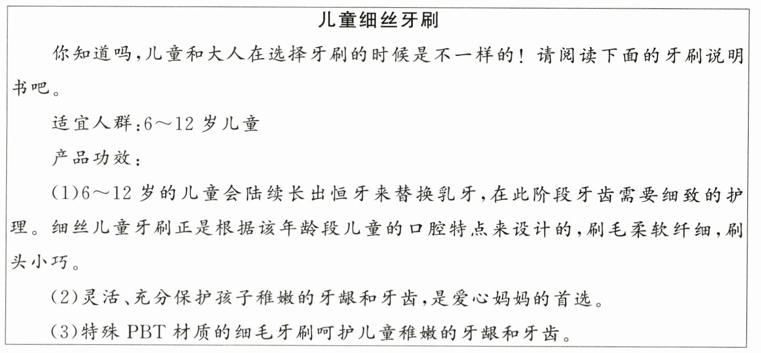 11. 从这款牙刷的说明书里,你认为小孩子的牙刷最好具备哪些特点呢?(3 分)