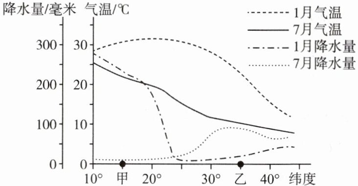 9. (2024·山东东营模拟)下图为沿某经线附近部分地区1月、7月的气温和降水量分布图。读图完成9~10题。