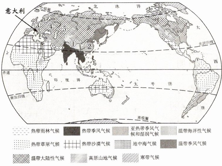 (3)承承发现地处亚欧大陆中纬度地区的③、④、⑤三地气温与降水量变化有以下规律:由③地至⑤地,气温年较差逐渐增大,而年降水量却呈现出递减趋势。请你解释造成这种现象的主要原因。