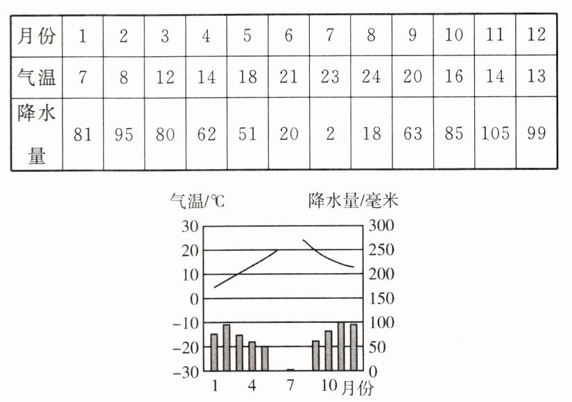 (4)小伟搜集了地中海沿岸的意大利罗马多年平均气温和降水量数据(见下表),请帮助他将图绘制完整。(气温单位:℃,降水量单位:毫米)