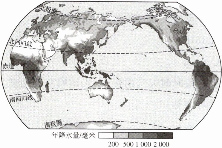 多年平均降水量也是反映一个地区气候特征的重要指标。读世界年降水量图,完成14~15题。