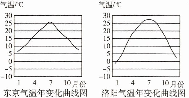 东京、洛阳均是位于35°N附近的城市,与靠近太平洋的东京相比,洛阳离大洋较远。