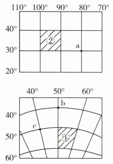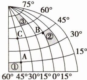 方向。(2)①②③三个阴影区域中,位于低纬度的是