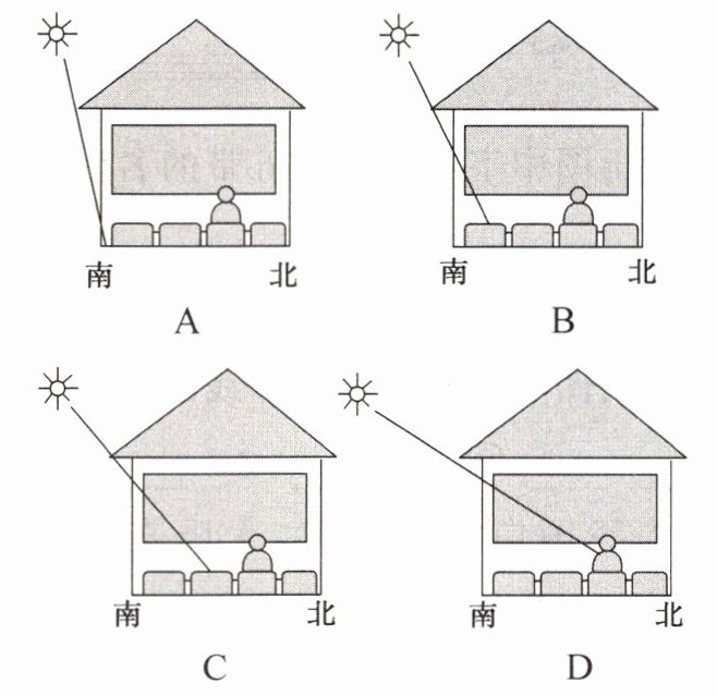 北京的小明善于观察。一年中,他在不同时期观察并记录了当地正午时刻教室内的光照情况(如下图所示)。据图回答第1题。