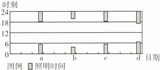 3. 细心的李明同学发现广州市路灯开闭的时间会随着季节发生变化,下图是湖北随州市二分二至日路灯照明时间图,图中b日是(