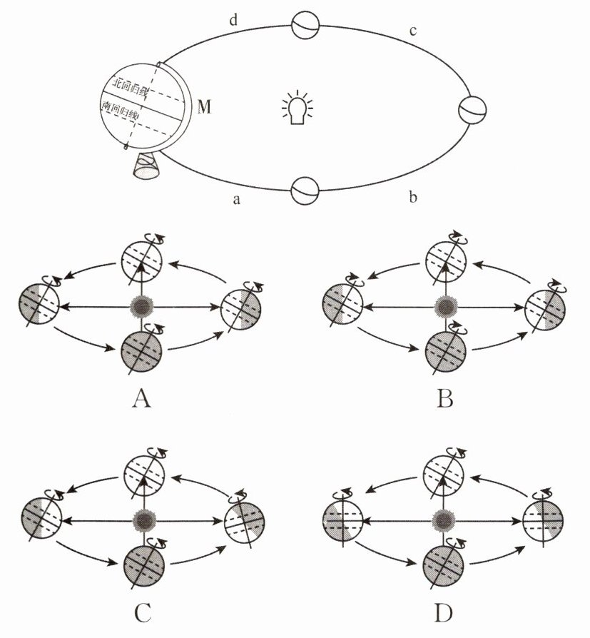 (4)某同学利用自己制作的地球仪,将灯光作为太阳光,演示地球的运动(如下图)。该同学手持地球仪从M位置开始围绕光源旋转一周,光线直射范围应该是