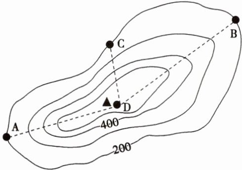 D.从A地爬到山顶D地比从B地爬到山顶D地容易