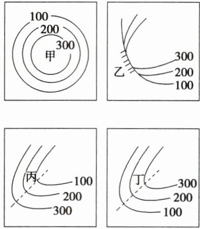 9. 下列四幅局部等高线地形图中(单位:米),有可能发育河流的是(