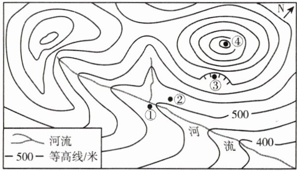 (2024·连云港中考)某年5月初,几位游客到我国东南部某山区旅游。此季节,该地已进入雨季。下图为该山区地形示意图(图中①~④处为露营的备选地点)。据此完成6~7题。
