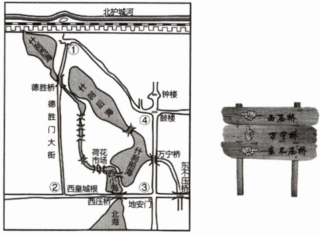 同学们计划去什刹海开展地理实践活动,下图为小明绘制的什刹海平面图。读图,完成 9~11 题。