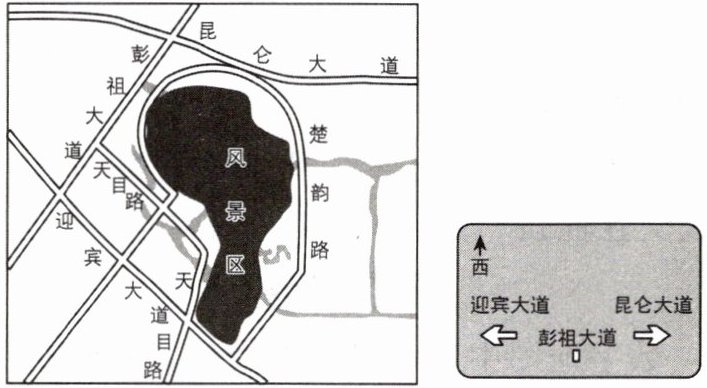 徐州大龙湖环湖路线颇受骑行爱好者的青睐。小明骑行出发前,用手机软件查询了该湖的骑行路线图。据此完成 1~2 题。