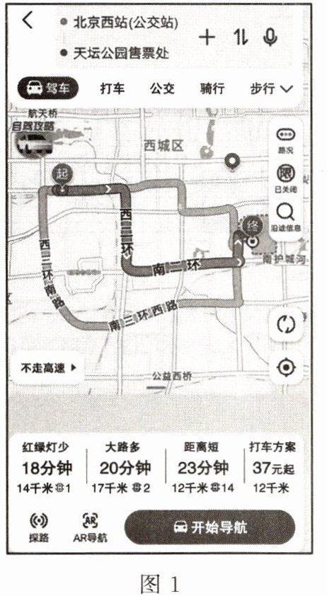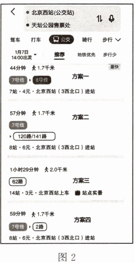 12.珠珠一家到北京旅游,出北京西站后,他们首先想到天坛公园游玩。珠珠打开手机导航查询,图 1 示意驾车路线,图 2 示意公交路线推荐的四种方案。读图,完成下列问题。