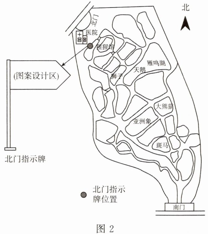 (5)图2中猩猩馆附近有“北门”指示牌。请完成图案设计区内容(可用文字或图案表示)。