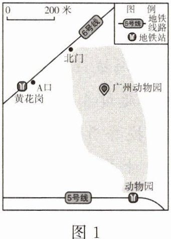 (6)由图1可知,图中比例尺为图上1厘米表示实地距离200米,广州动物园北门到黄花岗地铁站A口的图上距离约为1厘米,实际距离为200×1 = 200米。