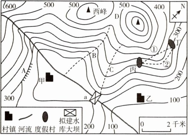 。(4)当地开发中,想整合旅游资源,改善交通,计划在丙和丁两个度假村之间修建一条旅游观光公路,从坡度陡缓来看,线路①②中坡度相对和缓的是