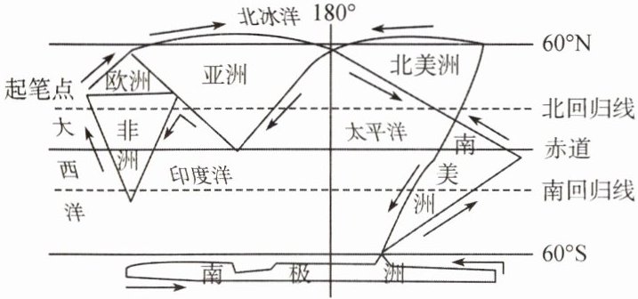 14. 某校同学通过“一笔画世界”活动学习世界的海陆分布,下图是某同学的作品。读图,回答下列问题。