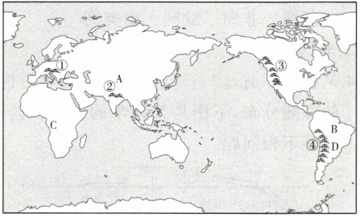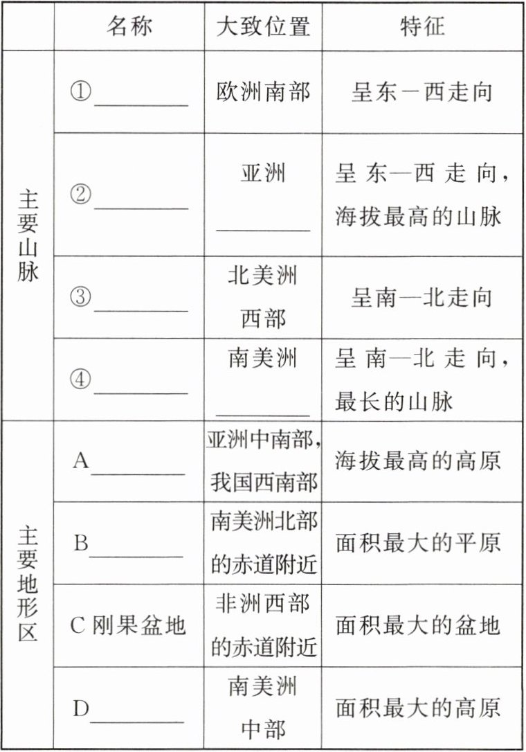 阿尔卑斯山脉 喜马拉雅山脉 中南部 落基山脉 安第斯山脉 西部 青藏高原 亚马孙平原 巴西高原