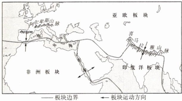 下图是红海、地中海、喜马拉雅山脉成因示意图。据此,完成3~4题。