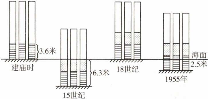 下图是意大利那不勒斯湾海岸的三根大理石柱升降变化图,石柱上横线部分代表其曾被火山灰覆盖,小黑点部分代表其被海洋生物钻孔。读图,完成2~3题。