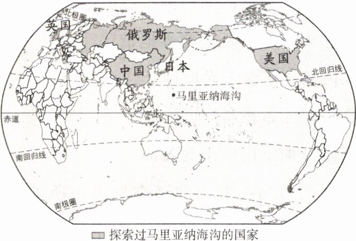 马里亚纳海沟深达11034米,号称"世界第四极"。2020年11月10日,中国研发的万米载人潜水器"奋斗者号"在马里亚纳海沟成功坐底,坐底深度10909米,刷新中国载人深潜的新纪录。下图为探索过马里亚纳海沟的国家分布示意图。读图,完成6~7题。