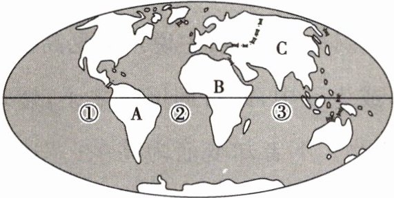 人类对地球海陆分布的认识,经历了极其漫长的过程。早期,人们只能认识人类足迹和视野所及的地方,直到19世纪末20世纪初,人类对地球表面的海陆分布才有一个基本正确的认识。读世界海陆分布示意图,回答3~4题。