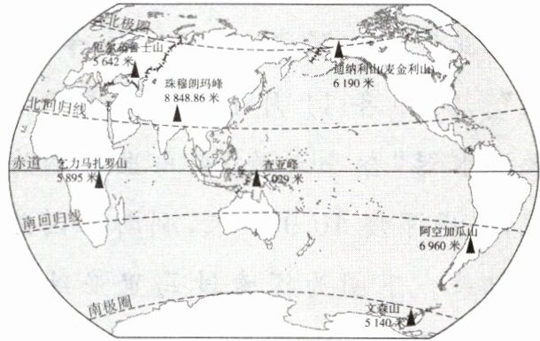 (2024·山东潍坊期中)世界七大洲的最高峰,是无数登山运动员向往的高山之巅。下图为世界七大洲最高峰分布示意图。读图,完成8~10题。