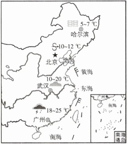 。(2)此日,哈尔滨、北京、武汉、广州四城市中,气温日较差最大的是