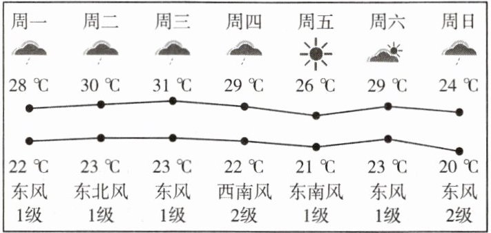 下图为某城市未来一周的天气预报示意图。读图,完成5~6题。