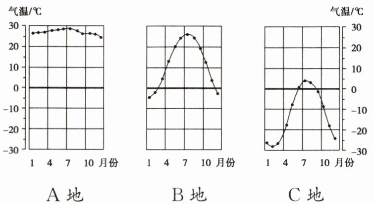 (3)A地在热带,因为各月气温都很高,都在20℃以上;B地在北温带,因为气温年较差较大,且四季分明,同时7月气温最高;C地在北寒带,因为各月气温都很低,气温年较差大,同时7月气温最高。