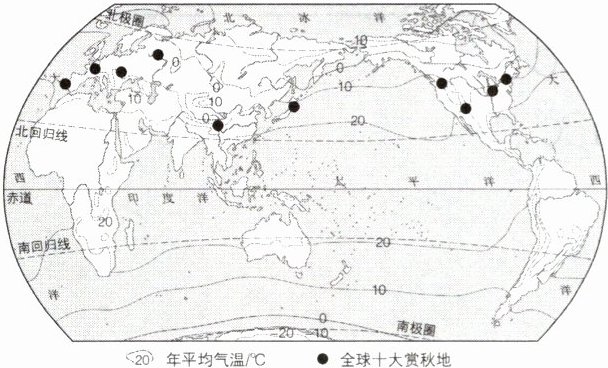 (2024·山东济南模拟)秋天是多彩的季节,某地理类杂志评选出了全球十大赏秋地。下图是世界年平均气温和全球十大赏秋地分布图。读图,完成 10~11 题。