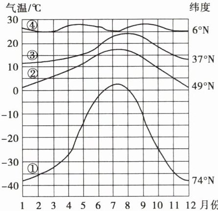下图为四个不同纬度地点一年中的气温变化曲线图。读图,回答 8~9 题。