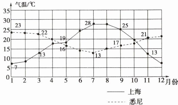4. 下图为上海和悉尼某年各月气温统计图。读图,从图中气温曲线可知