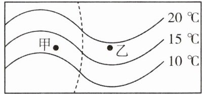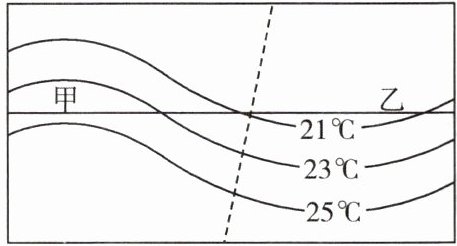 读某地区 7 月等温线分布图,甲、乙两地位于同一纬度,虚线表示海岸线。据此完成 6~7 题。