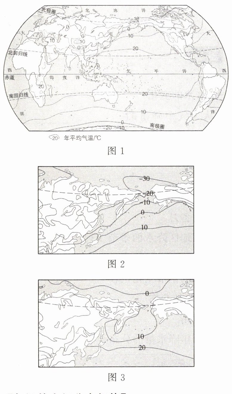 17. 运用地理图像,认识地理要素分布规律是地理学习内容之一。图 1 为世界年平均气温分布图,图 2 为某地区 1 月等温线分布图(单位:℃),图 3 为某地区 7 月等温线分布图(单位:℃)。读图,完成下列问题。