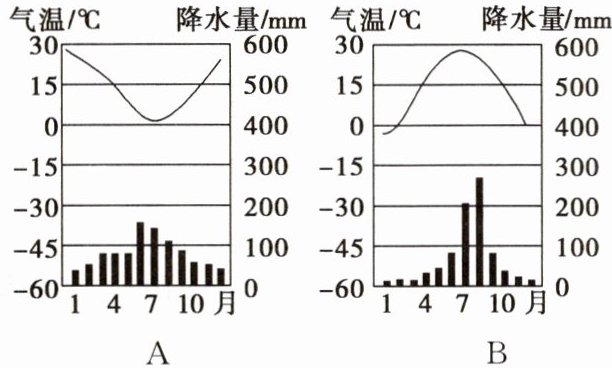15. 读 A、B 两地降水量柱状图和气温曲线图,分析回答下列问题。