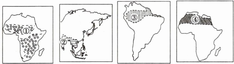 2.“在湿季,大草原一片葱绿,斑马、长颈鹿等动物成群结队迁徙而来。到了干季,满目枯黄,莽莽草原上,间或有一些耐旱的孤树……”这种景观所在的气候区是下列四幅示意图中的 (