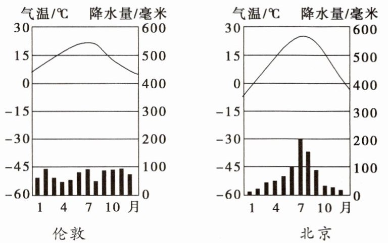 4.下图是伦敦和北京的气候资料图,下列对两地气候的描述,正确的是 (